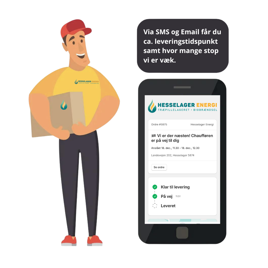 Du får også et forsendelseslink på leveringsdagen. Her kan du se det forventede leveringstidspunkt samt hvor mange stop vi er væk.